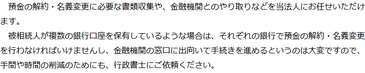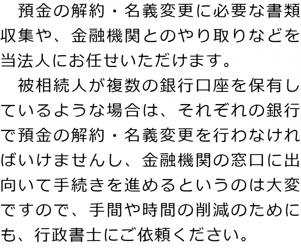 トップ業務内容預金・貯金の解約・名義変更 階層構造▼ 業務内容(目次) 預金・貯金の解約・名義変更 業務内容(目次)業務内容トップ行政書士法人心の業務内容遺言遺産整理相続人調査相続財産調査遺産分割協議書の作成預金・貯金の解約・名義変更証券口座の解約・名義変更自動車の名義変更心グループのその他の業務内容家族信託・民事信託節税対策事業承継遺言の検認相続放棄限定承認遺産分割遺留分侵害額請求相続登記相続税申告相続税調査 受付時間 平日 9時~21時、土日祝 9時~18時 夜間・土日祝の相談も対応します (要予約) 所在地 〒273-0005 千葉県船橋市本町6-1-7KENEDIX船橋3F(旧表記:エスペランサK3F) 0120-2403-39 お問合せ・アクセス・地図