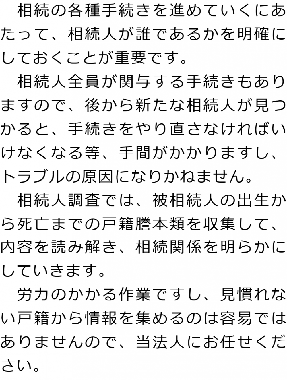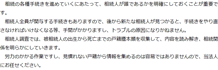 トップ業務内容相続人調査 階層構造▼ 業務内容(目次) 相続人調査 業務内容(目次)業務内容トップ行政書士法人心の業務内容遺言遺産整理相続人調査相続財産調査遺産分割協議書の作成預金・貯金の解約・名義変更証券口座の解約・名義変更自動車の名義変更心グループのその他の業務内容家族信託・民事信託節税対策事業承継遺言の検認相続放棄限定承認遺産分割遺留分侵害額請求相続登記相続税申告相続税調査 受付時間 平日 9時~21時、土日祝 9時~18時 夜間・土日祝の相談も対応します (要予約) 所在地 〒273-0005 千葉県船橋市本町6-1-7KENEDIX船橋3F(旧表記:エスペランサK3F) 0120-2403-39 お問合せ・アクセス・地図