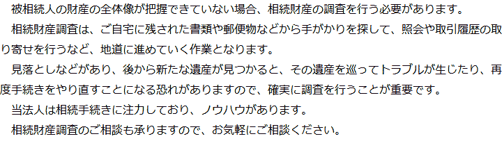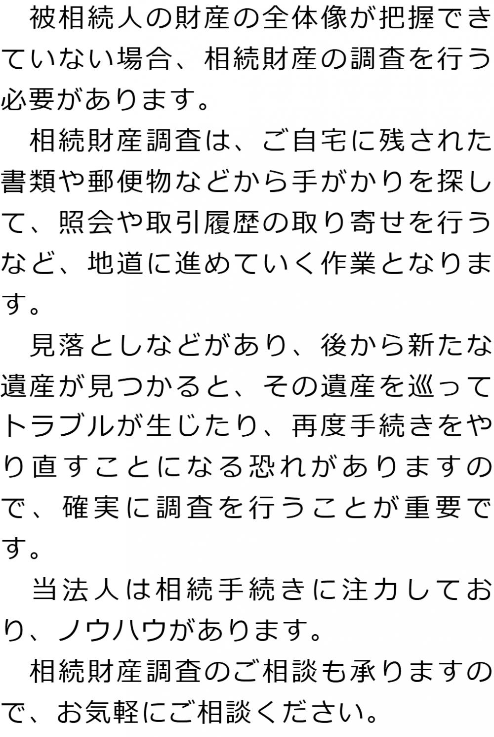 トップ業務内容相続財産調査 階層構造▼ 業務内容(目次) 相続財産調査 業務内容(目次)業務内容トップ行政書士法人心の業務内容遺言遺産整理相続人調査相続財産調査遺産分割協議書の作成預金・貯金の解約・名義変更証券口座の解約・名義変更自動車の名義変更心グループのその他の業務内容家族信託・民事信託節税対策事業承継遺言の検認相続放棄限定承認遺産分割遺留分侵害額請求相続登記相続税申告相続税調査 受付時間 平日 9時~21時、土日祝 9時~18時 夜間・土日祝の相談も対応します (要予約) 所在地 〒273-0005 千葉県船橋市本町6-1-7KENEDIX船橋3F(旧表記:エスペランサK3F) 0120-2403-39 お問合せ・アクセス・地図