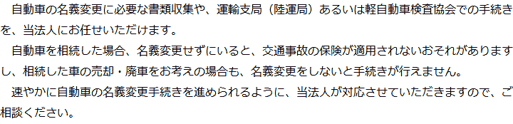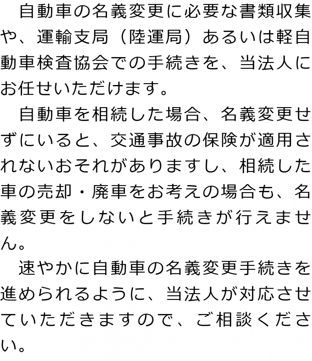 トップ業務内容自動車の名義変更 階層構造▼ 業務内容(目次) 自動車の名義変更 業務内容(目次)業務内容トップ行政書士法人心の業務内容遺言遺産整理相続人調査相続財産調査遺産分割協議書の作成預金・貯金の解約・名義変更証券口座の解約・名義変更自動車の名義変更心グループのその他の業務内容家族信託・民事信託節税対策事業承継遺言の検認相続放棄限定承認遺産分割遺留分侵害額請求相続登記相続税申告相続税調査 受付時間 平日 9時~21時、土日祝 9時~18時 夜間・土日祝の相談も対応します (要予約) 所在地 〒273-0005 千葉県船橋市本町6-1-7KENEDIX船橋3F(旧表記:エスペランサK3F) 0120-2403-39 お問合せ・アクセス・地図