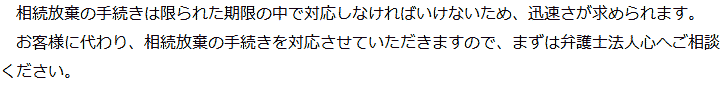 トップ業務内容相続放棄 階層構造▼ 業務内容(目次) 相続放棄 業務内容(目次)業務内容トップ行政書士法人心の業務内容遺言遺産整理相続人調査相続財産調査遺産分割協議書の作成預金・貯金の解約・名義変更証券口座の解約・名義変更自動車の名義変更心グループのその他の業務内容家族信託・民事信託節税対策事業承継遺言の検認相続放棄限定承認遺産分割遺留分侵害額請求相続登記相続税申告相続税調査 受付時間 平日 9時~21時、土日祝 9時~18時 夜間・土日祝の相談も対応します (要予約) 所在地 〒273-0005 千葉県船橋市本町6-1-7KENEDIX船橋3F(旧表記:エスペランサK3F) 0120-2403-39 お問合せ・アクセス・地図