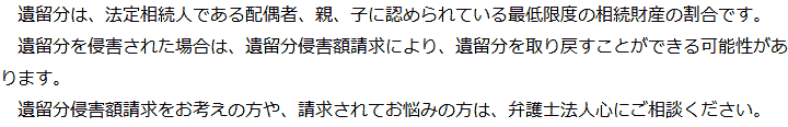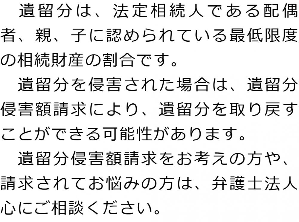 トップ業務内容遺留分侵害額請求 階層構造▼ 業務内容(目次) 遺留分侵害額請求 業務内容(目次)業務内容トップ行政書士法人心の業務内容遺言遺産整理相続人調査相続財産調査遺産分割協議書の作成預金・貯金の解約・名義変更証券口座の解約・名義変更自動車の名義変更心グループのその他の業務内容家族信託・民事信託節税対策事業承継遺言の検認相続放棄限定承認遺産分割遺留分侵害額請求相続登記相続税申告相続税調査 受付時間 平日 9時~21時、土日祝 9時~18時 夜間・土日祝の相談も対応します (要予約) 所在地 〒273-0005 千葉県船橋市本町6-1-7KENEDIX船橋3F(旧表記:エスペランサK3F) 0120-2403-39 お問合せ・アクセス・地図